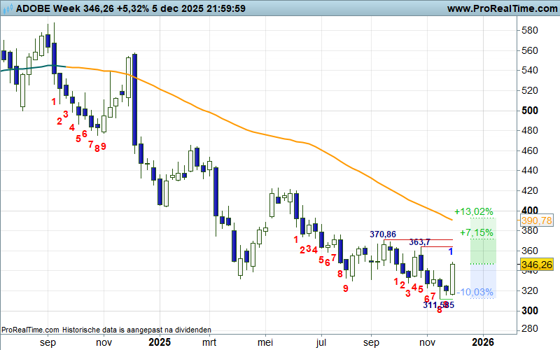 Met de jaarultimo in zicht is het altijd interessant om op zoek te gaan naar koopjes, om daarmee de portefeuille of trading posities nog wat extra glans te geven. Welnu, de weekchart van Adobe geeft aan dat de bulls een eindejaarssprint willen inzetten. Een interessante propositie met een minder fraaie Risk Reward Ratio, maar wel uitdagend voor koopjesjagers.