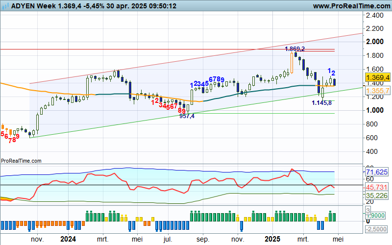 De cijferregen deze week op het Damrak zorgt in het algemeen voor een positieve stemming, maar niet voor Adyen dat positieve en hoopvolle berichtgeving afgestraft ziet worden met een koersdaling van ruim 5%, het kan verkeren. Ik zal de weekchart voor u duiden.