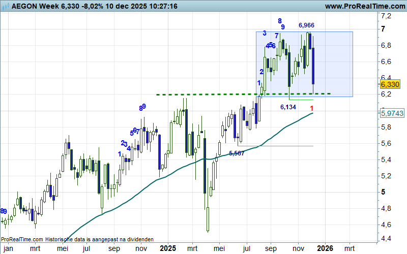 De huidige stabilisatie toont de contouren van een tradingbox met als onderlijn afgerond €6,20 en als bovenlijn €6,96. Met lange candles, afwisselend wit en zwart, zwiept de koers heen en weer tussen de genoemde krijtstrepen. Deze week een stevige zwarte candle, de beren delen een flinke tik uit. Maar zoals het er nu naar uitziet, wordt de tik opgevangen onder in de tradingbox. De beren slaan toe, maar de bulls zijn niet verslagen zolang het lukt om boven €6,2 te blijven bewegen.
