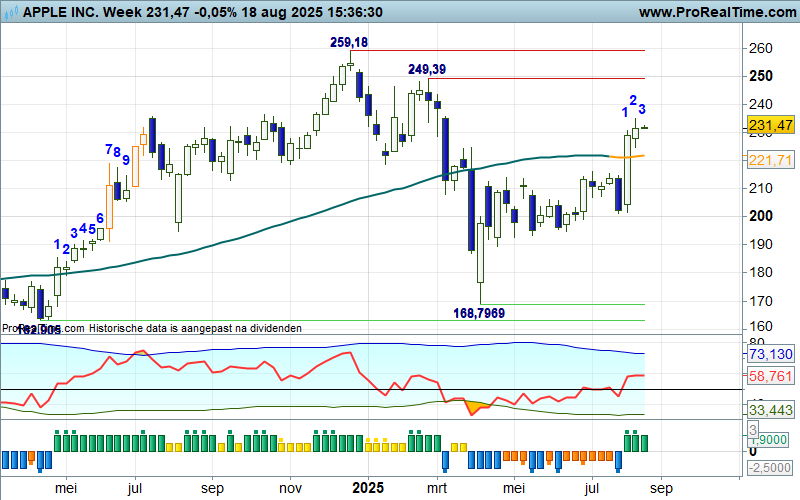 Zolang de koers boven afgerond $220 blijft bewegen, krijgen de bulls de gelegenheid om de trend te vervolgen. Opstomen naar de rode strepen op $249 en $259, dat is de opdracht voor de bulls. Dat zijn haalbare koersdoelen, die uiteraard niet in één rechte streep gehaald zullen worden. Tussentijdse berentikken blijven haalbaar.