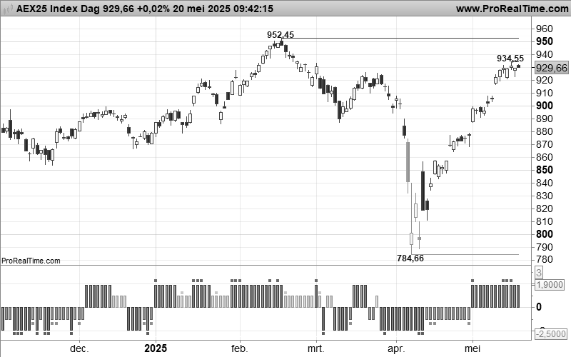 De conditie wordt weergegeven met een staaf met eigen kleur. De UP status is herkenbaar aan de groene staaf op de nullijn. De DOWN status kent een blauwe staaf aan de nullijn. De CORRECTIE status wordt aangeduid met een gele staaf, de REBOUND is oranje. U ziet, de kleuren in de indicator komen overeen met die in de Dashboard publicatie.