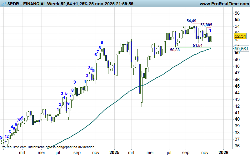 ETF’s zijn populair omdat ze drie dingen tegelijk bieden: spreiding, eenvoud en lage kosten. In plaats van te “gokken” op één aandeel, spreid je automatisch over tientallen of zelfs honderden bedrijven. En dat verlaagt je risico. Zo is er de ETF Financial Sector die momenteel een aantrekkelijke grafiek toont. Interessant om een Turbo Long positie te overwegen om daarmee de positieve verwachtingen in de sector Financials te volgen. Ik zal de weekgrafiek voor u duiden.