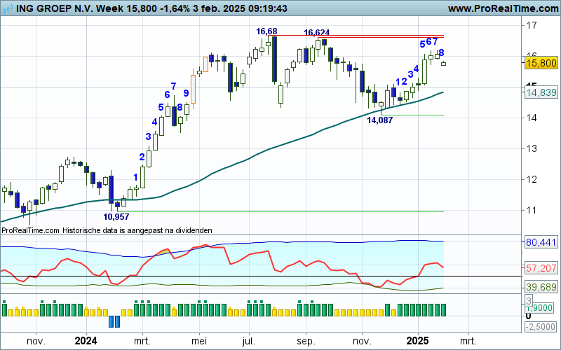 Voor trendvolgende beleggers toont de grafiek een onrustig zijwaarts koersbeeld. Voor hen een pas op de plaats in afwachting van nieuwe kansen. Volgens de indicatoren mogen koopposities worden aangehouden en zijn er logischerwijs additionele koopkansen  boven de €16,25 weerstandzone. Onder €14+ komt de onrustige trend in gevaar. Dan ook koopposities afbouwen, aldus de coach.