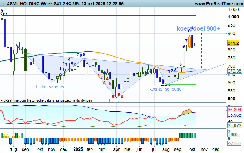 Vorige week is dit koersdoel even aangetikt, waarna er toch een schrikreactie volgde uit de stierenhoek, de koers viel terug naar €800+. Deze terugval past in het plaatje, want de doorbraak boven de neklijn moet nog worden gevalideerd.