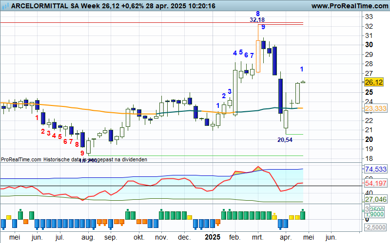 Aan turbulentie geen gebrek op de aandelenvelden, beer en stier zorgen voor flinke koersuitslagen, zo ook op de weekchart van Arcelor Mittal. Op dit speelveld gaan de bulls proberen de grillige uptrend een extra impuls te geven. Ik zal de chart voor u duiden.