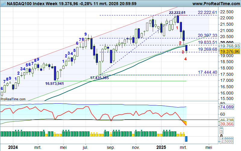 Zeer geruime tijd was er sprake van een sterke uptrend, ofwel een stevig proces van hogere toppen en hogere bodems tot aan een recente top op ruim 22.000. Daarna volgde een volatiele correctie terug naar de SMA-lijn en de steunlijn van het stijgingskanaal zo rond 20.000. Daar zou normaal gesproken gebodemd moeten worden, maar gezien de heftige turbulentie lukt dat niet. Deze week duikt de index onder de SMA-lijn en uit het stijgingskanaal, hetgeen ik een negatieve overgangsfase noem. Er is niet direct sprake van een dalende trendfase, daarvoor moet er meer gebeuren. Of kunnen de bulls een trendomkeer vermijden?