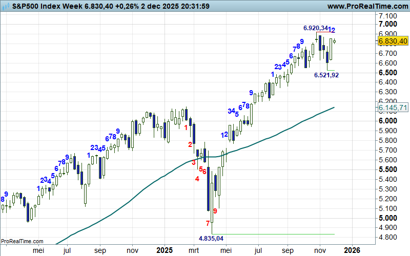 We moeten terug naar april 2023 toen de koers overtuigend de SMA lijn overstak, om daarna noordwaarts te bewegen in een grillig proces van hogere toppen en hogere bodems boven een fier opkrullende gemiddelde lijn. Toen noteerde de S&P500 rond 4100, nu staat er 6800+ op het scherm, toch een leuk rendement als je als trendvolgende belegger netjes de trend had gevolgd. De flinke dip in april dit jaar was wel even spannend, maar de bulls wisten rap te overleven.