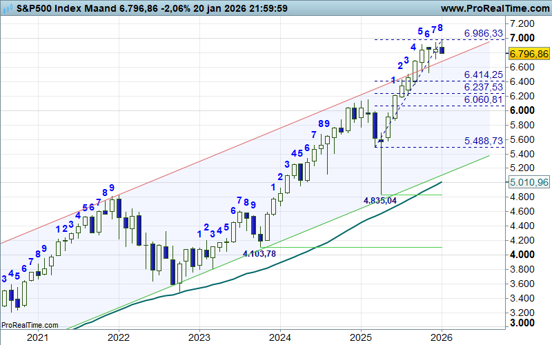 Het jaar 2026 is bijna al weer een maand oud en dan blijkt dat de Amerikaanse beursbarometer S&P500 slecht is gestart. Januari gaat de boeken in als ‘beren maand’, vooral veroorzaakt door allerlei onrust in de wereld. Als dit maar geen voorbode is voor de rest van het jaar. Wat kunnen we aflezen uit de maandgrafiek?
