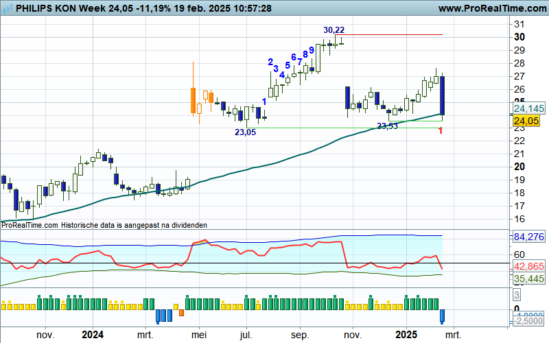 Volgens analisten gaf Philips een terughoudende outlook af. Dat werd afgestraft met een koersval van ruim 11%. Maar geen nood, de bulls zijn niet verslagen, ze moeten even de wonden likken om daarna de draad weer op te pakken. Althans, dat herbergt de weekgrafiek. Sta mij toe deze chart voor u te duiden.